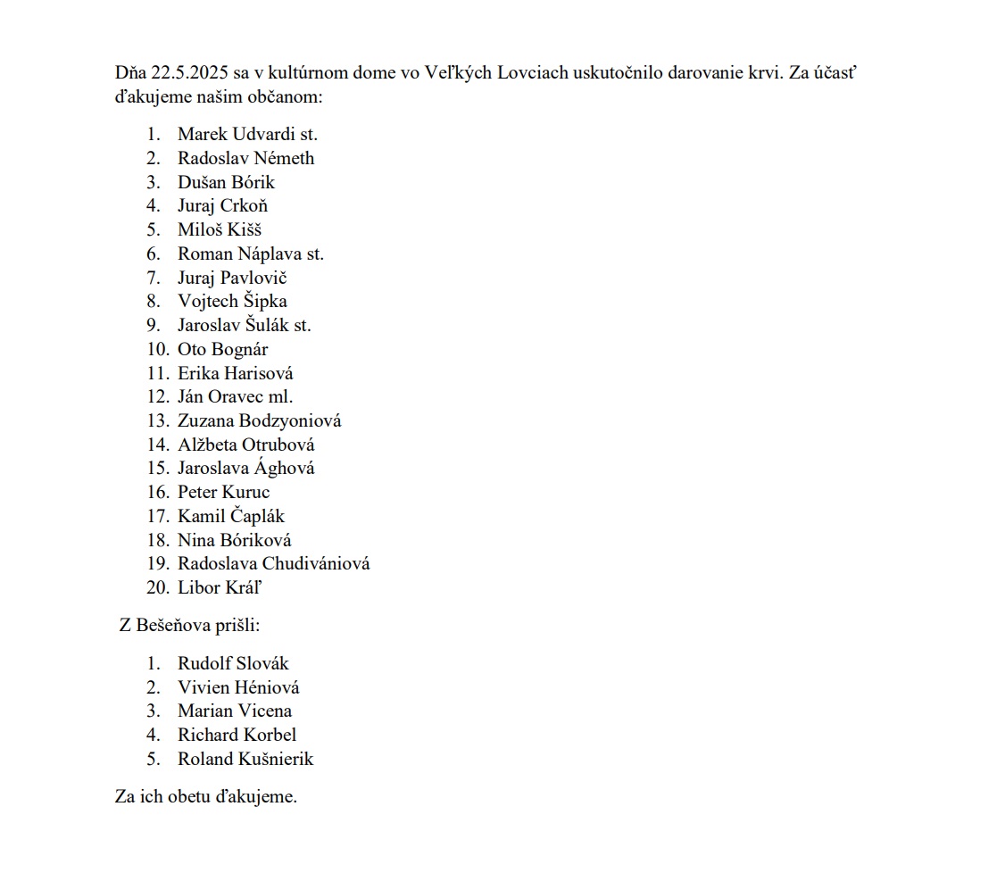 Dňa 22.5.2025 sa v kultúrnom dome vo Veľkých Lovciach uskutočnilo darovanie krvi. Zúčastnili sa nielen naši občania ale aj občania z Bešeňova. Za ich obetu ďakujeme.